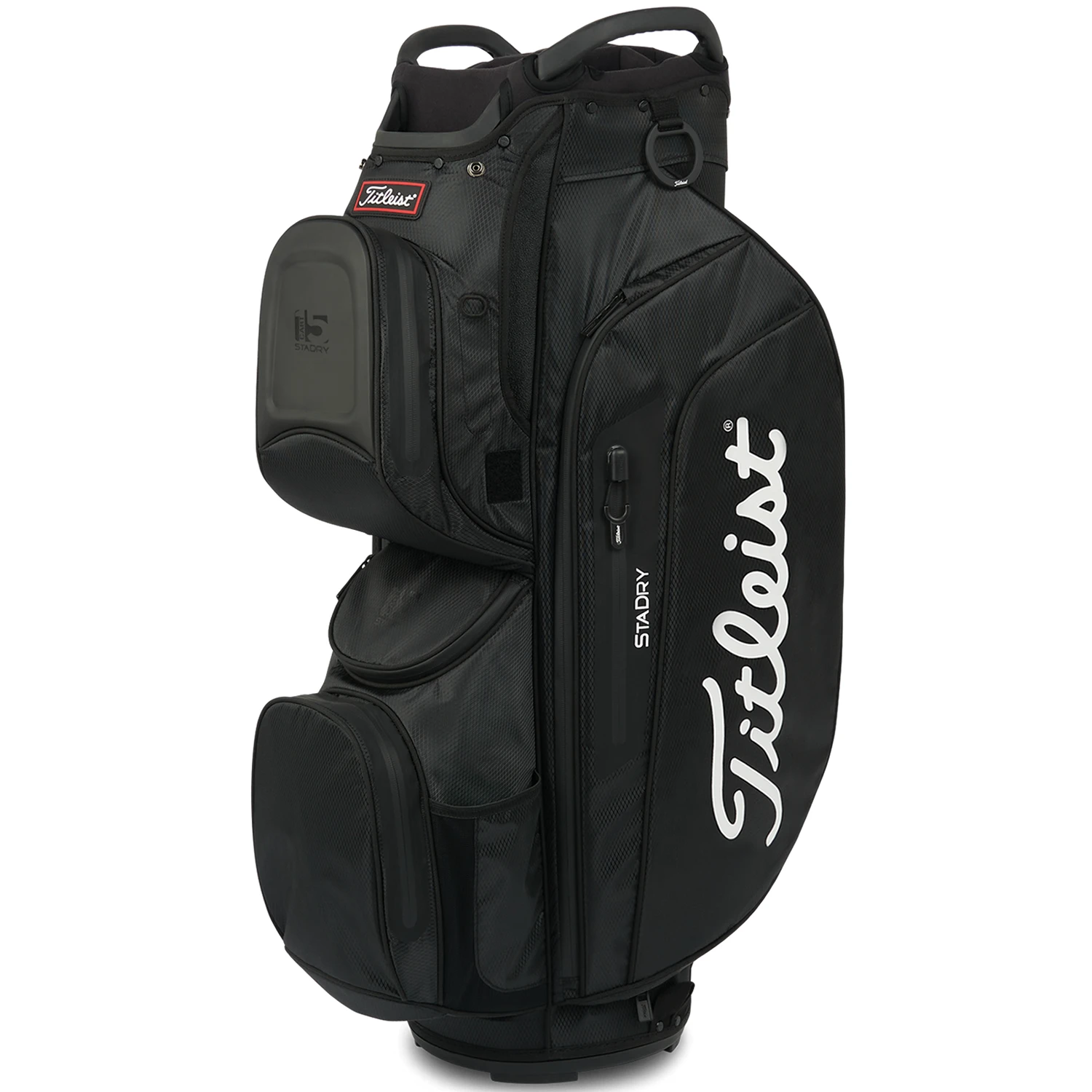 Titleist Stadry Cart 15 Bag 2022 – fully waterproof featured, but functional, premium waterproof cart bag. Its a great price for such a flagship waterproof bag. StaDry 15 way Trolley Cart Bag – because it is the most spacious cart bag from Titleist while remaining lightweight. It features a 15 way divider with a dedicated putter well but full length dividers for perfect club organisation. A cart strap channel allows access to pockets while on a trolley or buggy. Nine pocket in total including apparel, two velour lined valuables pockets, a ball pocket, accessories pockets and two water bottle compartments.