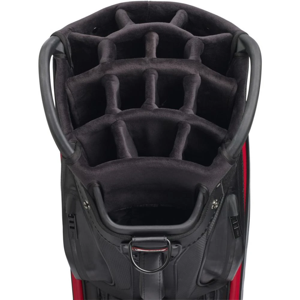 Combined with the performance knowing your clubs are in safe hands and your equipment is away from the elements with the waterproof zips. The Optimal Blend of Organization with the difference between this and the midsize cart bag is the 15 way divider, waterproof stadry pockets and a slightly larger tour like appeal. Its heavier but super robust. The Titleist Jet Black Stadry Premium Waterproof Cart Bag.