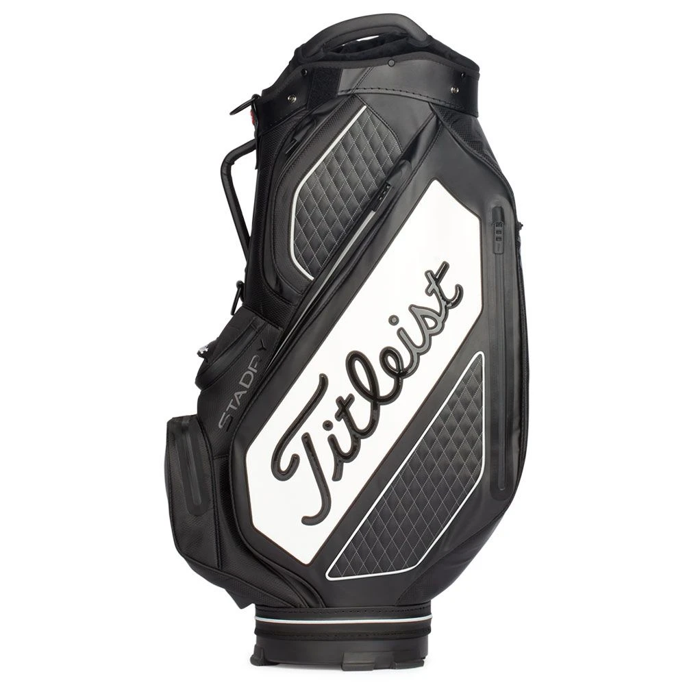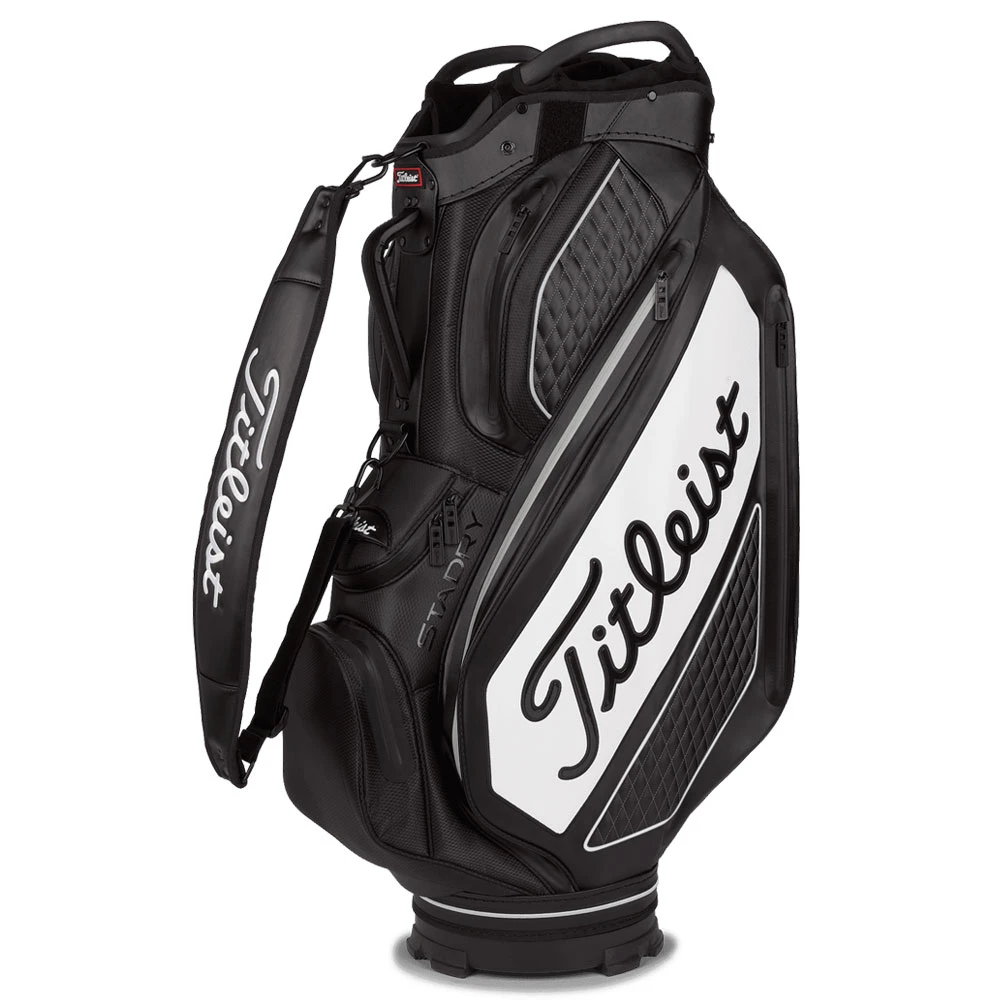 The Titleist Tour Series StaDry Premium Cart Tour bag is now available. Contemporary styling and materials enhance the Titleist cart Bag. Textured foam-padded vinyl, in combination with lightweight, durable woven polyester. And with classy quality stitching to combine with the Tour Series range. Its a various material and colour overlays give this classic bag but an easy to clean very manageable low maintenance but stunning tour bag look. Yet this bag is more manageable on a cart with keeping totally dry without the big tour bag price. Make no doubt this is a staff bag size which is designed for your cart trolley but it is easy to access. And not have the bulk or big weight that a large tour bag has.